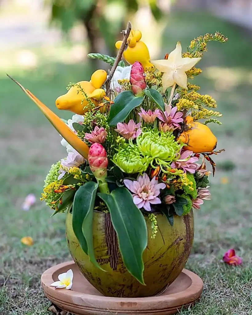 На Бали много хороших флористов, и они делают модные Pin-Up букеты в корейском стиле. Работы с цветами в местном колорите неподражаемы, но никто не делает каркасные букеты и подобные тем, что были на курсе.
